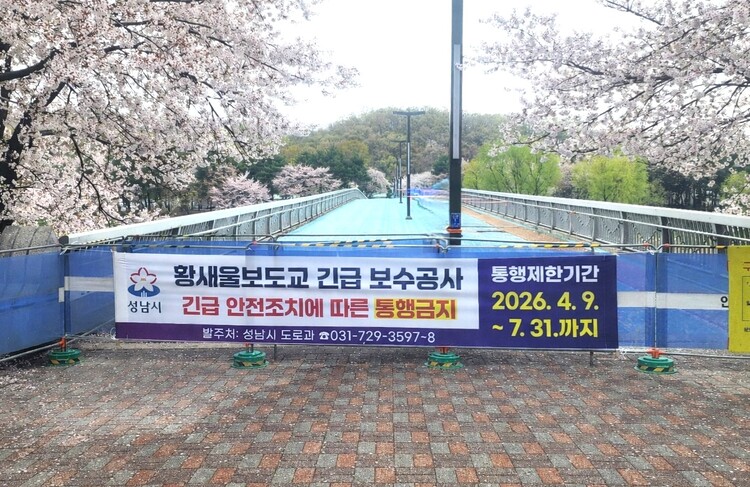 성남시(시장 신상진)는 수내동 소재 탄천을 횡단하는 ‘황새울보도교’에서 구조적 결함인 슬래브 균열이 발견됨에 따라, 시민 안전을 확보하기 위해 4월 9일부터 교량 통행을 전면 금지한다고 밝혔다.
